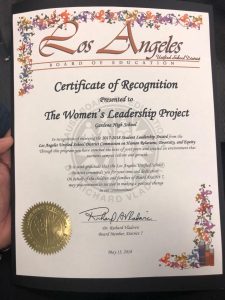 In May 2018, youth leaders from the Women’s Leadership Project and Young Male Scholars received an award from the Los Angeles Unified School District for outstanding human relations youth leadership.